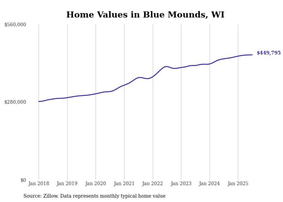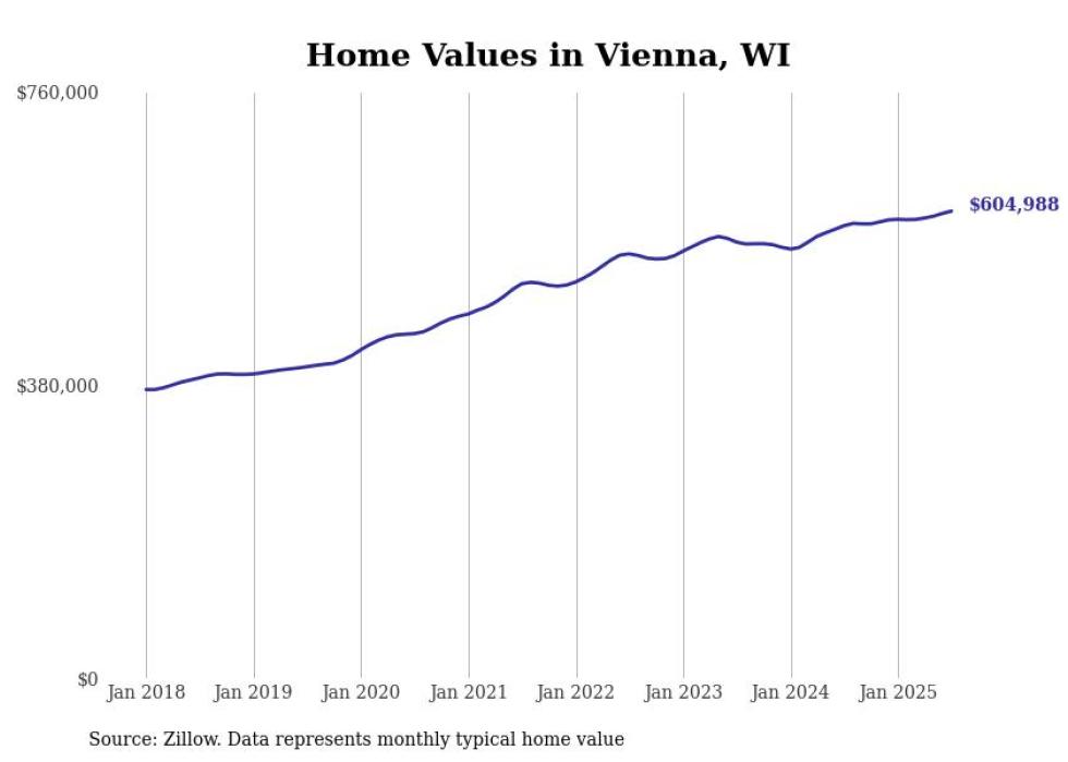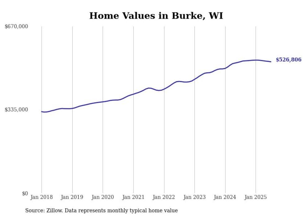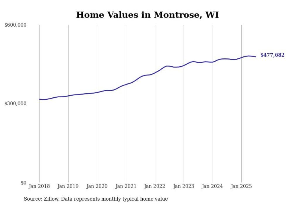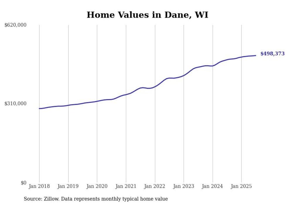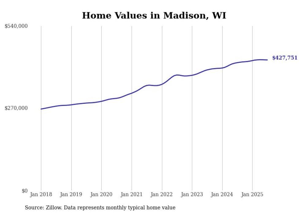 Stacker compiled a list of cities with the most expensive homes in the Madison metro area using data from Zillow. Charts show the monthly typical home value since January 2018. Data was available for 58 cities and towns.