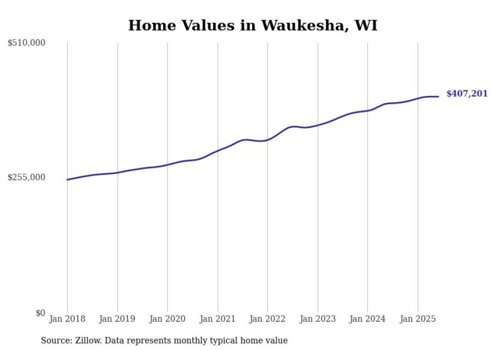 Stacker compiled a list of cities with the most expensive homes in the Milwaukee-Waukesha, WI metro area using data from Zillow. Charts show the monthly typical home value since January 2018.
