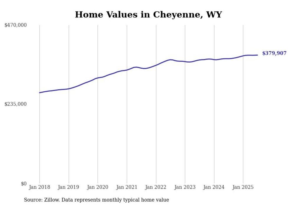 Stacker compiled a list of cities with the most expensive homes in the Cheyenne metro area using data from Zillow. Charts show the monthly typical home value since January 2018. All 4 cities and towns with data available were included in the list.
