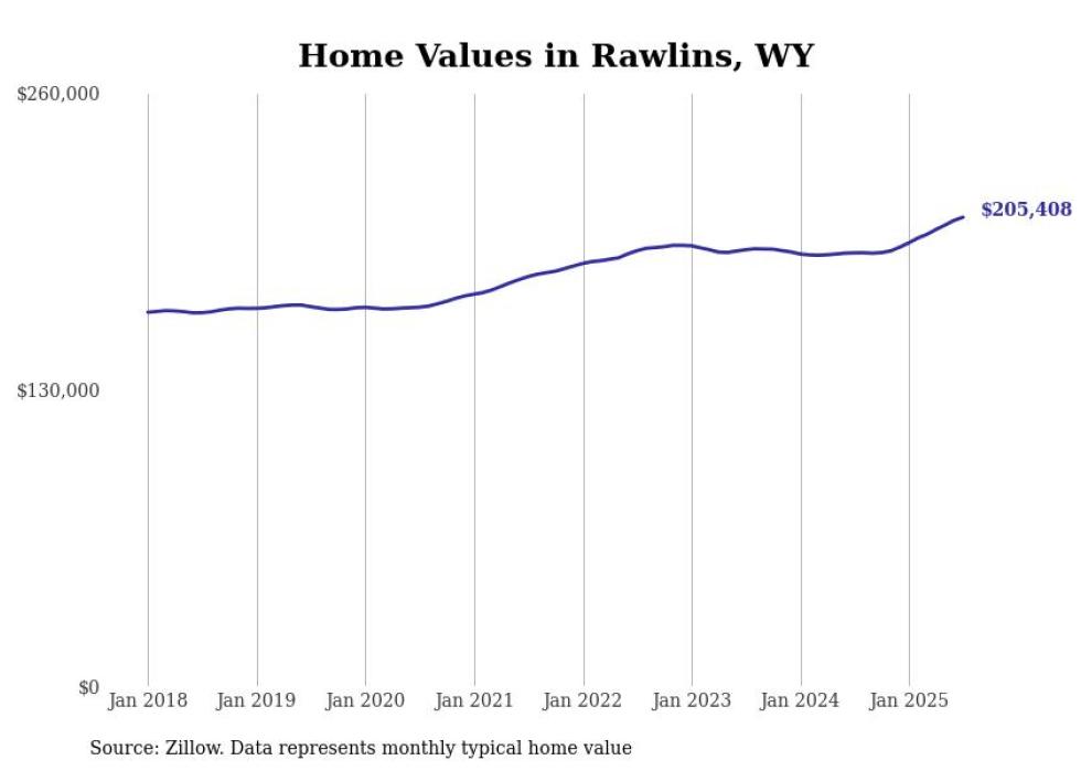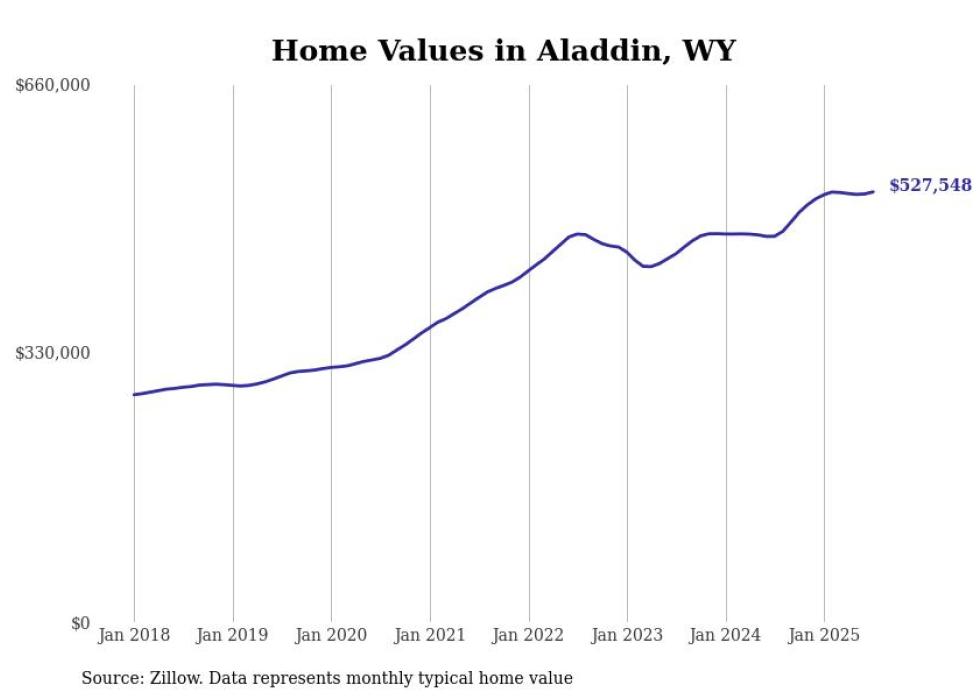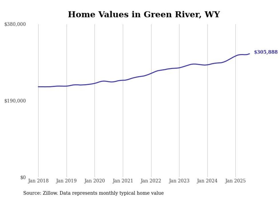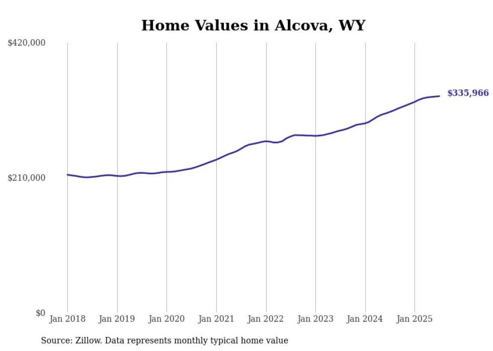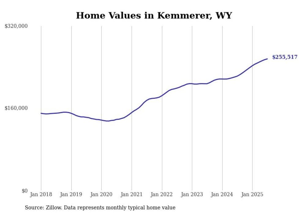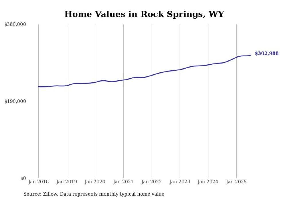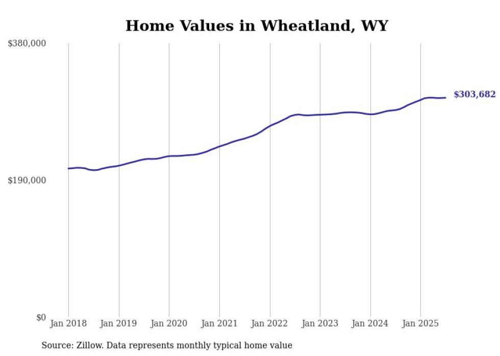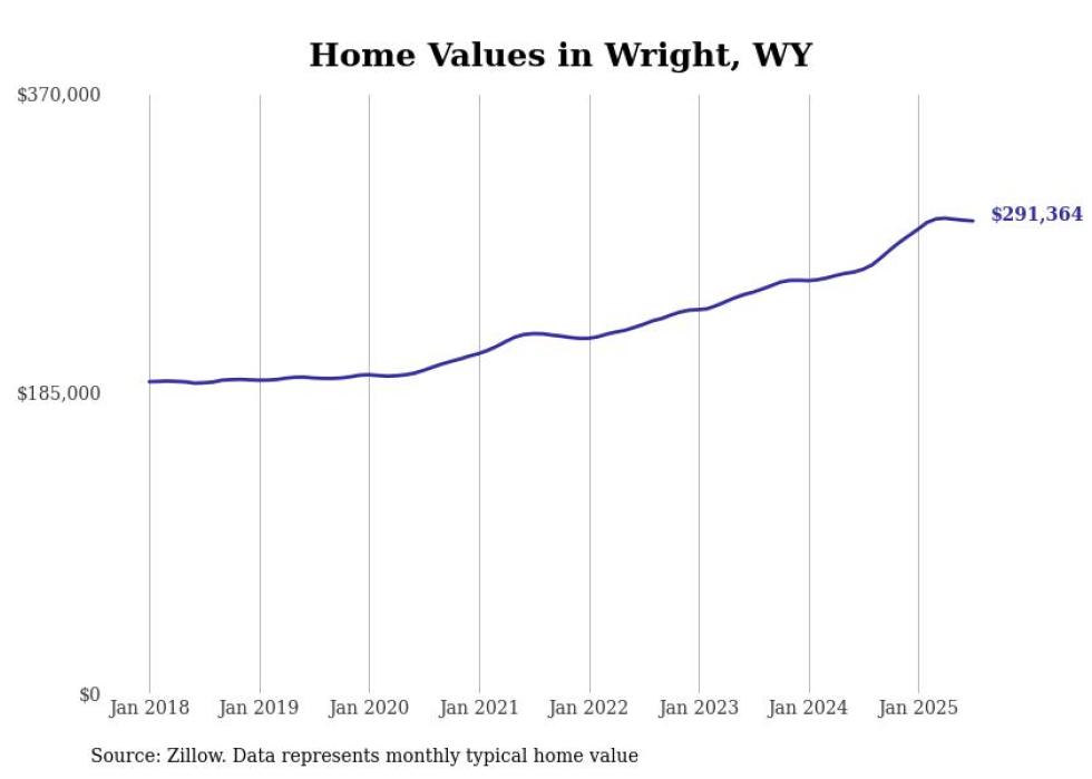 Stacker compiled a list of cities with the fastest-growing home prices in Wyoming using data from Zillow. Cities are ranked by the dollar change in the Zillow Home Values Index for all homes from the 12 months ending July 2025. The charts in this story were created automatically using Matplotlib. Data was available for 50 cities and towns in Wyoming.
