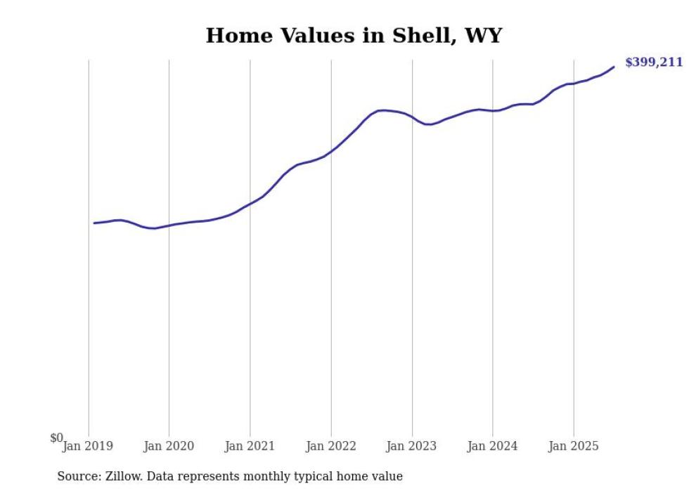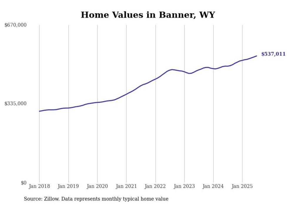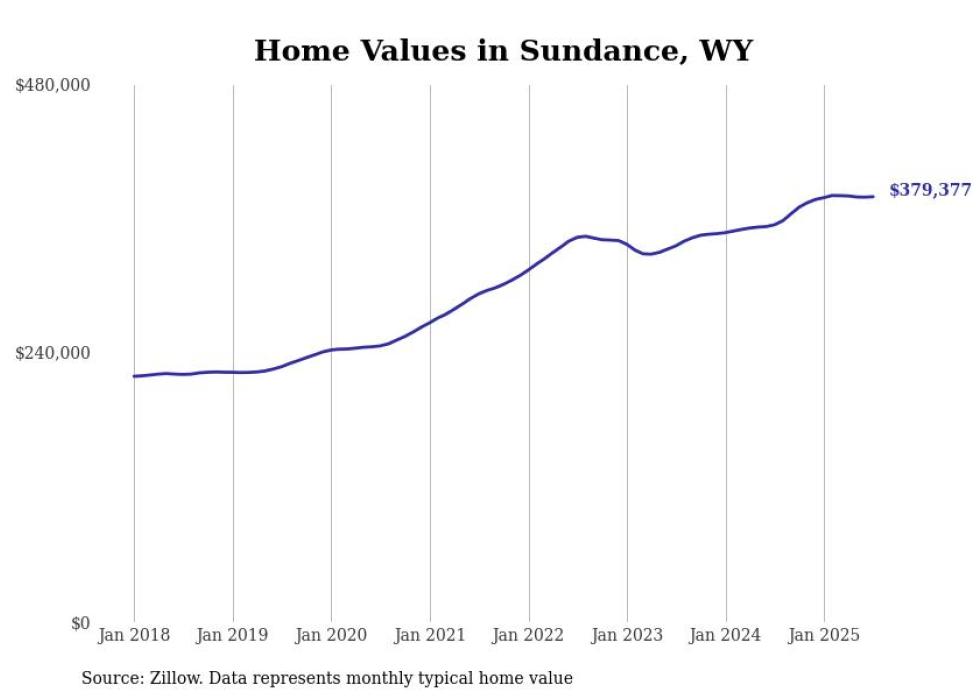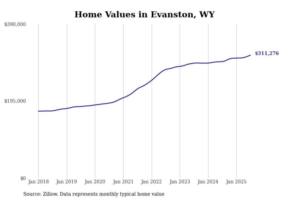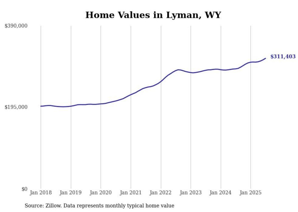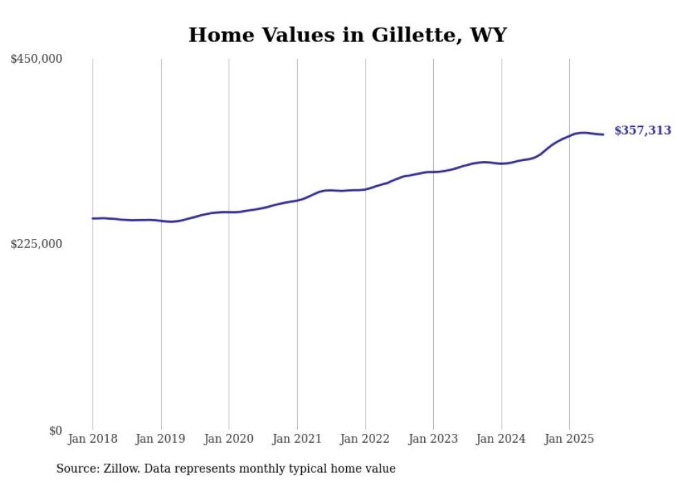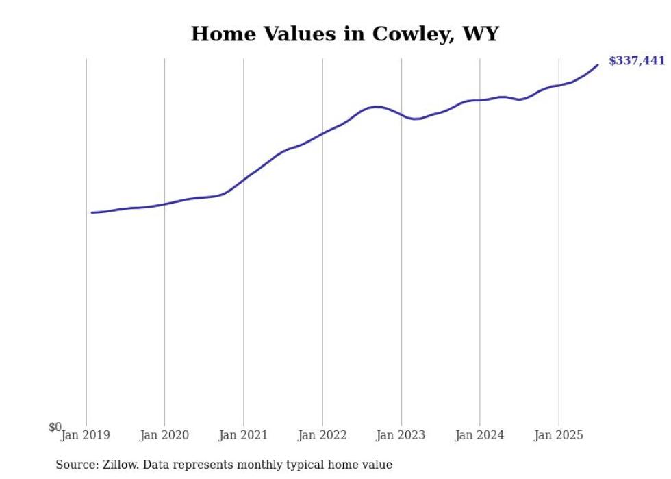 Stacker compiled a list of cities with the fastest-growing home prices in Wyoming using data from Zillow. Cities are ranked by the dollar change in the Zillow Home Values Index for all homes from the 12 months ending July 2025. The charts in this story were created automatically using Matplotlib. Data was available for 50 cities and towns in Wyoming.