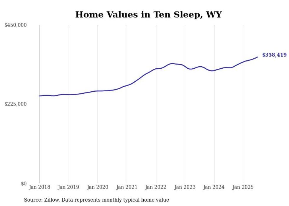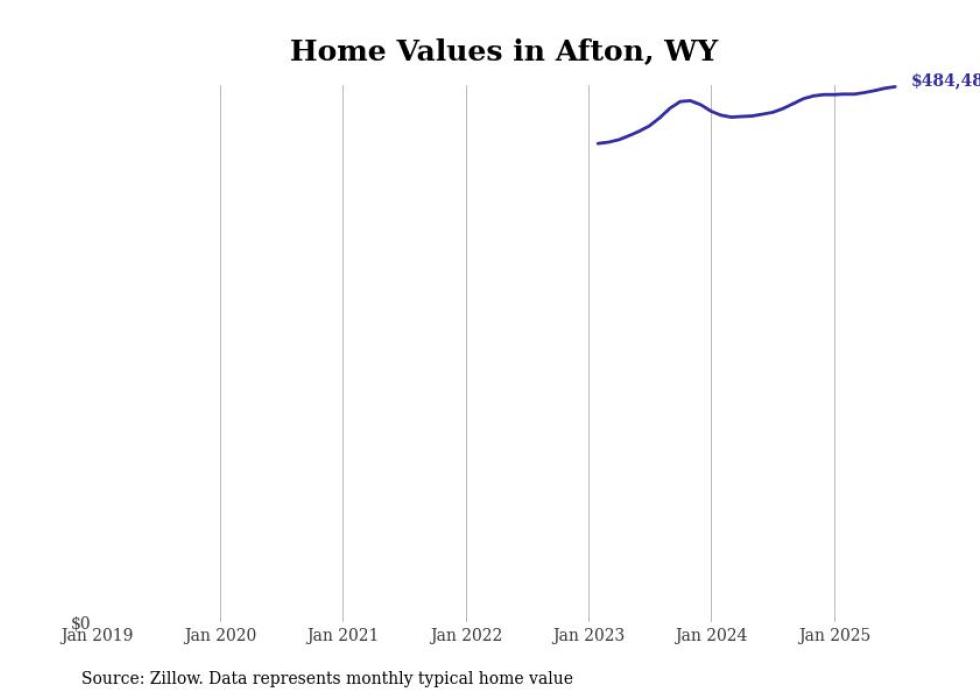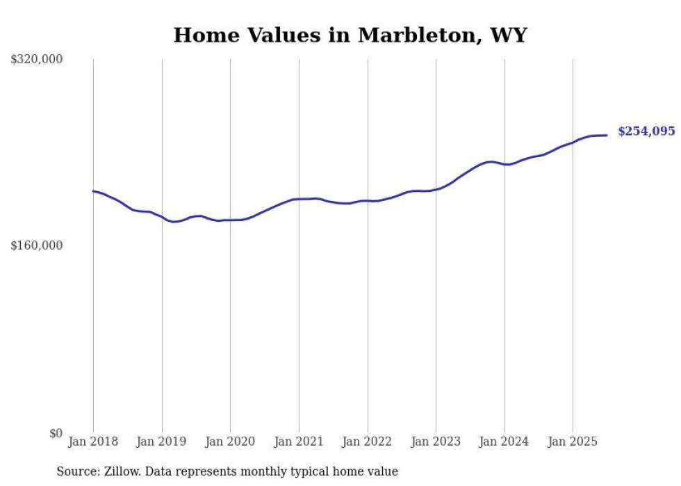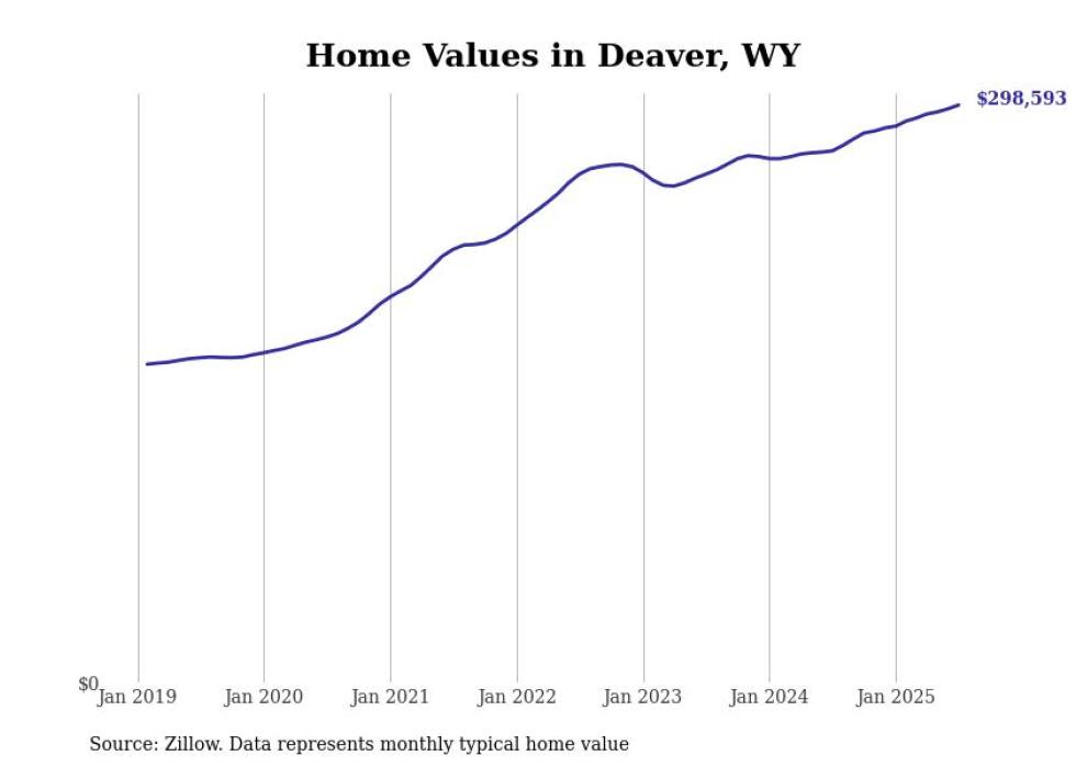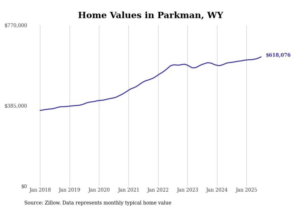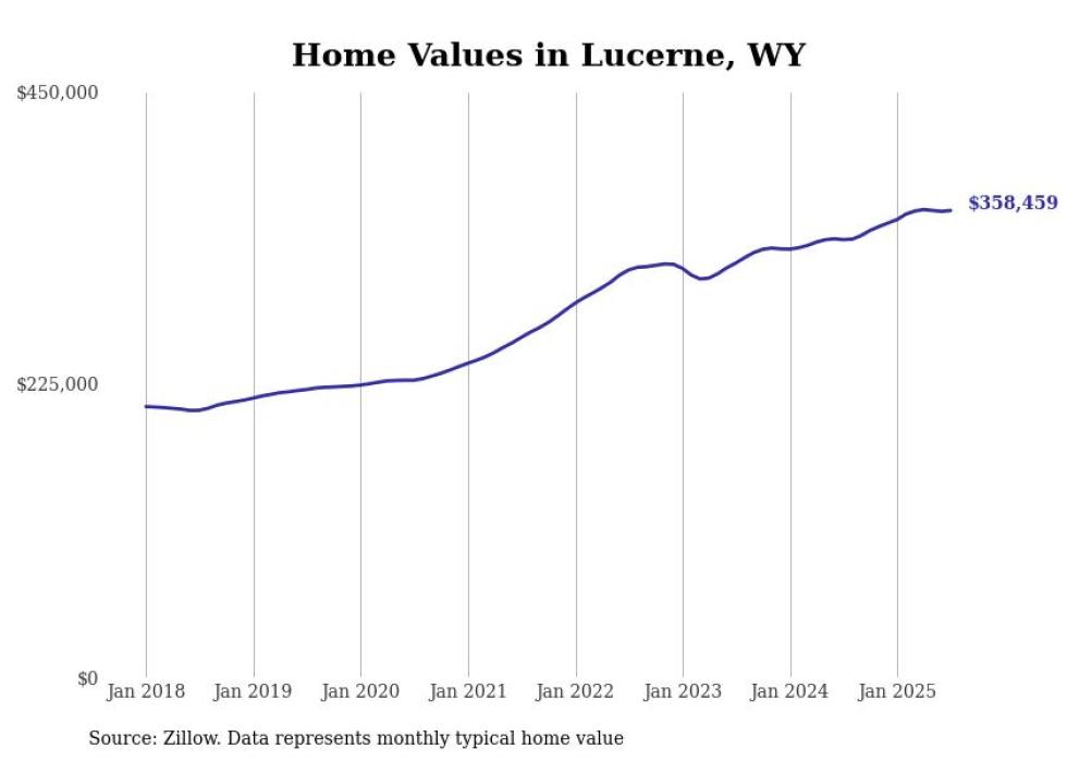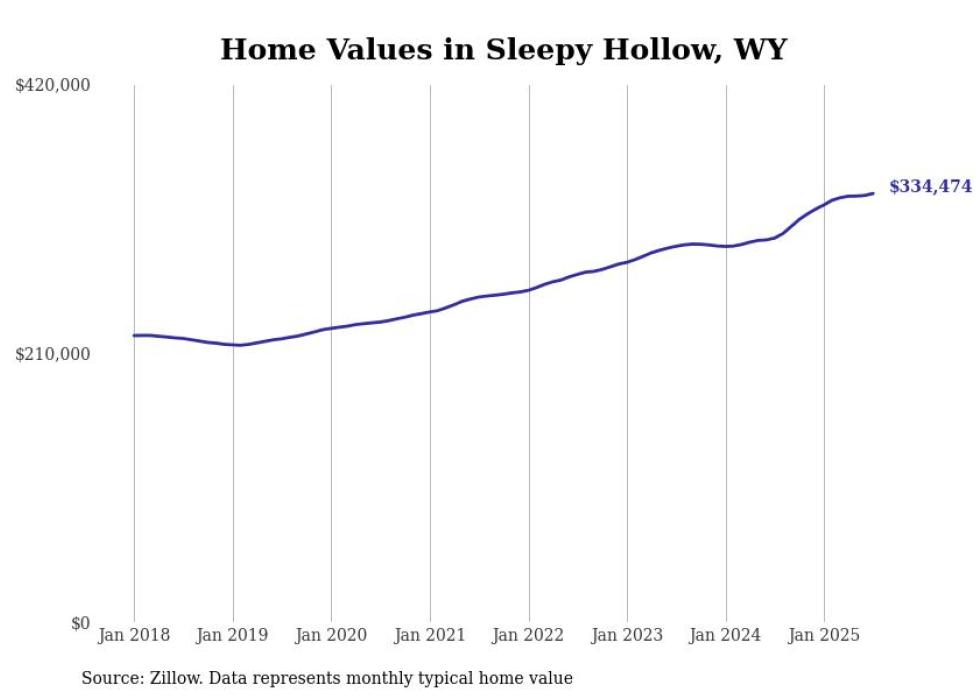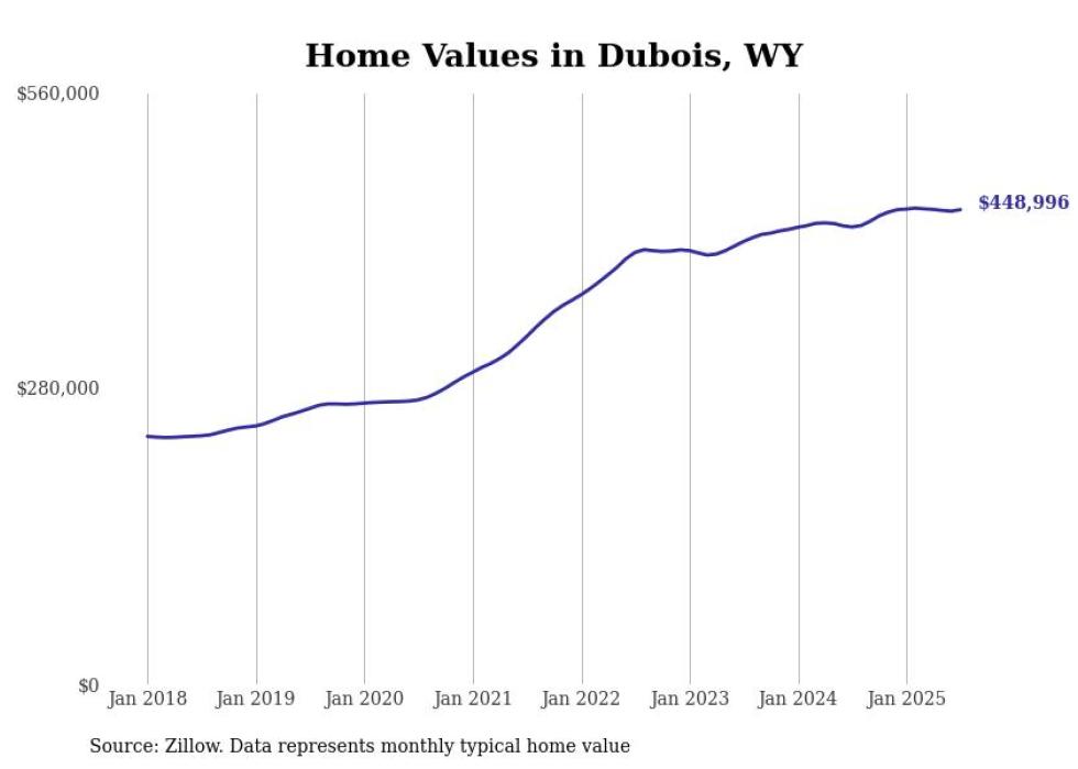 Stacker compiled a list of cities with the fastest-growing home prices in Wyoming using data from Zillow. Cities are ranked by the dollar change in the Zillow Home Values Index for all homes from the 12 months ending July 2025. The charts in this story were created automatically using Matplotlib. Data was available for 50 cities and towns in Wyoming.